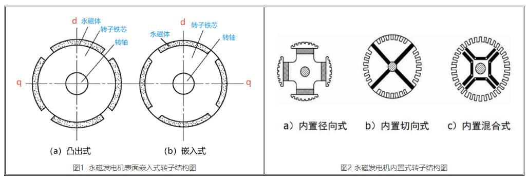 图1里已经标明了二种表层式转子的d中心线与q轴线的部位,d中心线与发电机的电机转子磁场所属的中心线重叠,q中心线超前的d轴90电角度,即邻近2个磁场的集合中性化中心线。因为在不一样电机转子里的磁极对数不一样,因此q轴与d轴中间的机器角度差时不同类型的,可是电角度的差全是90度。