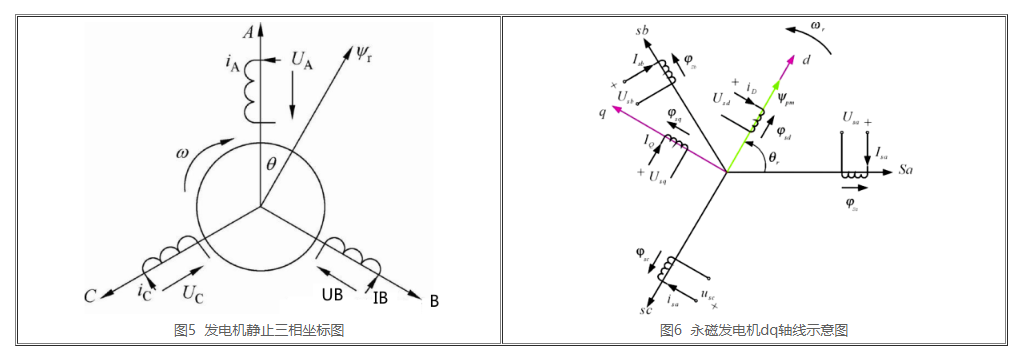 根据旋转变换,能将永磁同步发电机在ABC三相静止不动平面坐标中的交流电压量转换到电机转子平面坐标下,如下图5所显示。由此可以得: