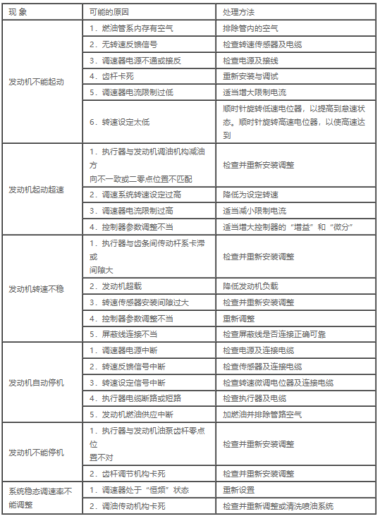 调速电机在使用、调节和使用过程中发生不正常情况,请参阅表4-1解决。若查验处理之后常见故障并未清除,且确定发动机系统没问题,请向康明斯发电机组生产商联络。不具有检修要求的客户,请不盲目折解,避免扩张常见故障。